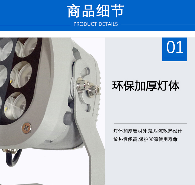 2、采用加厚鋼化玻璃,硬度大不易開裂,透光率高3、散熱器采用加厚鋁材外殼,對流散熱設(shè)計散熱性能高,保護光源使用壽命